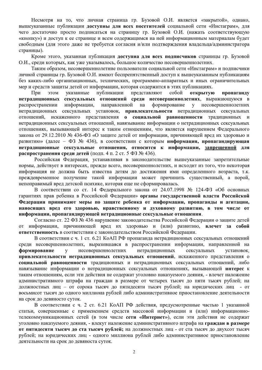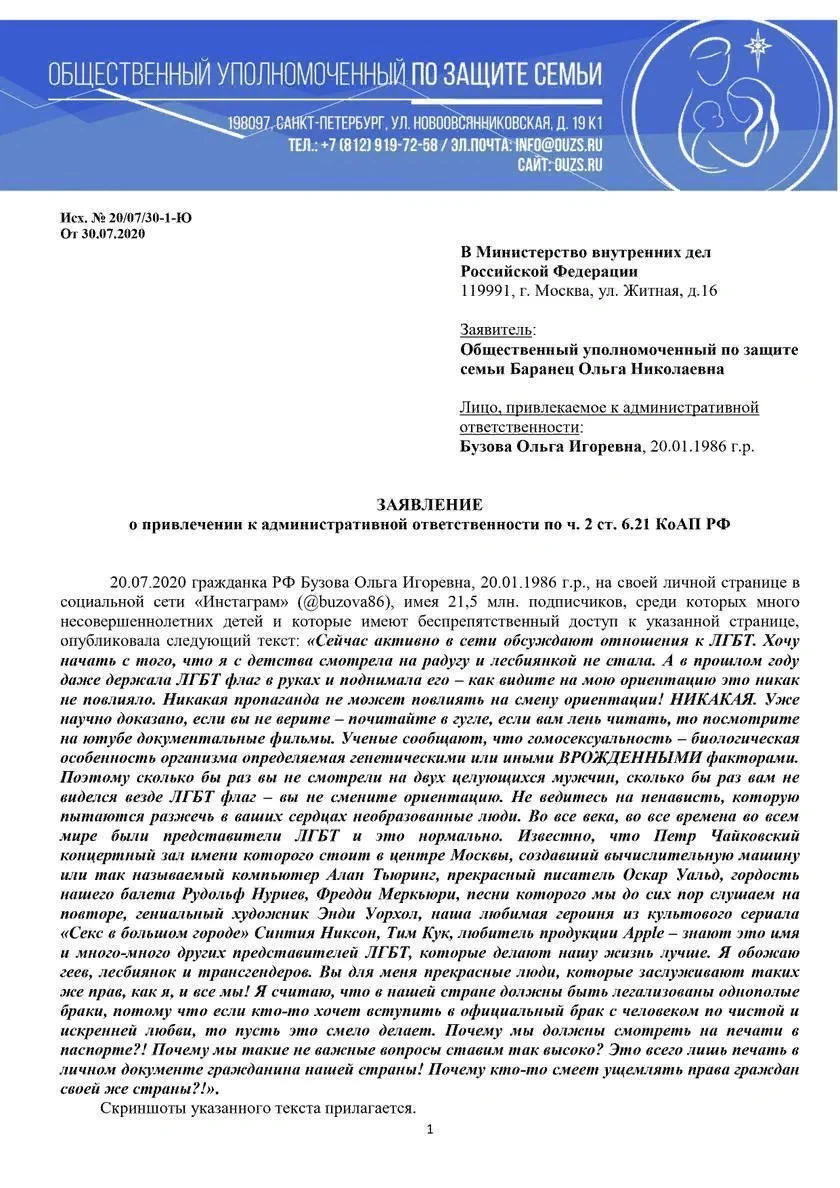 И все было бы без разницы, если бы данную плохо образованную дамочку, которая пишет, не думая, не читали миллионы детей, которые верят «кумиру» на слово: Бузова ведь сказала, а значит, правда, и спать мальчику с мальчиком, девочке с девочкой и далее по списку – это нормально, хорошо и модно. Притом мнение кумира всегда будет выигрывать у «скучных» родителей и учителей – вон какая Ольга популярная, вся в блестяшках, а эти все со своими науками. Поэтому экспертный центр Общественного уполномоченного по защите семьи в Санкт-Петербурге и Ленинградской области решил потребовать привлечь певичку к ответственности за пропаганду педерастии детям.