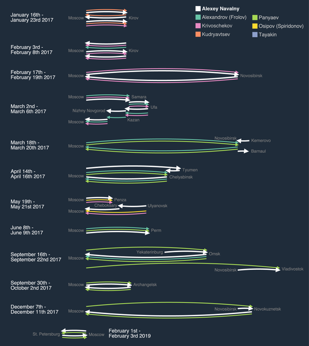 - За Навальным начали следить как минимум в начале 2017 года, когда он впервые объявил о планах баллотироваться на пост президента, говорится в расследовании. В рамках кампании Навальный в течение 2017 года совершил десятки поездок по России. Как утверждается в расследовании, сотрудники ФСБ «сопровождали» Навального практически в каждой поездке — в Омск, Пермь, Пензу, Ульяновск и другие города. Исключением стали короткие командировки, когда он не ночевал в пункте назначения. «Всего эти сотрудники ФСБ совершили 47 поездок по тем же направлениям, куда летел или ехал Алексей Навальный», — пишет The Insider.