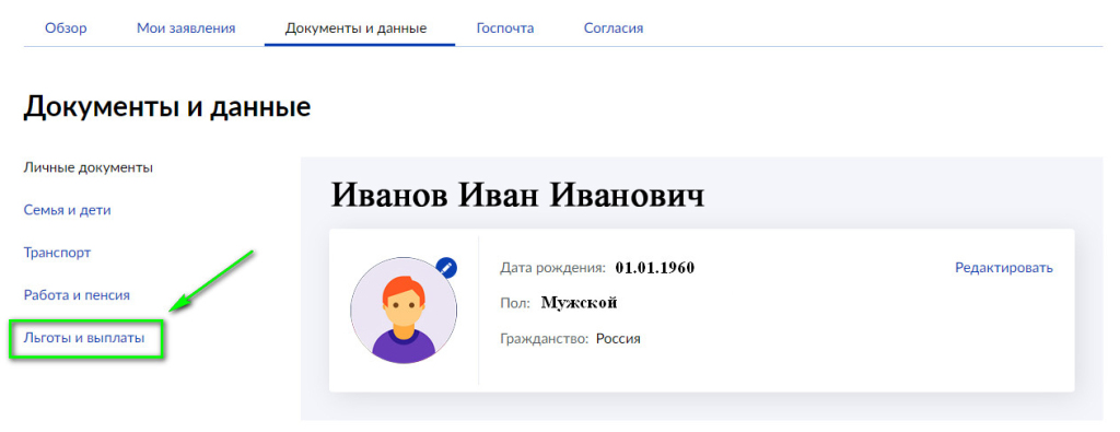Портал отправляет вас ко всем нашим данным. Где нужно выбрать вкладку «Льготы и выплаты».