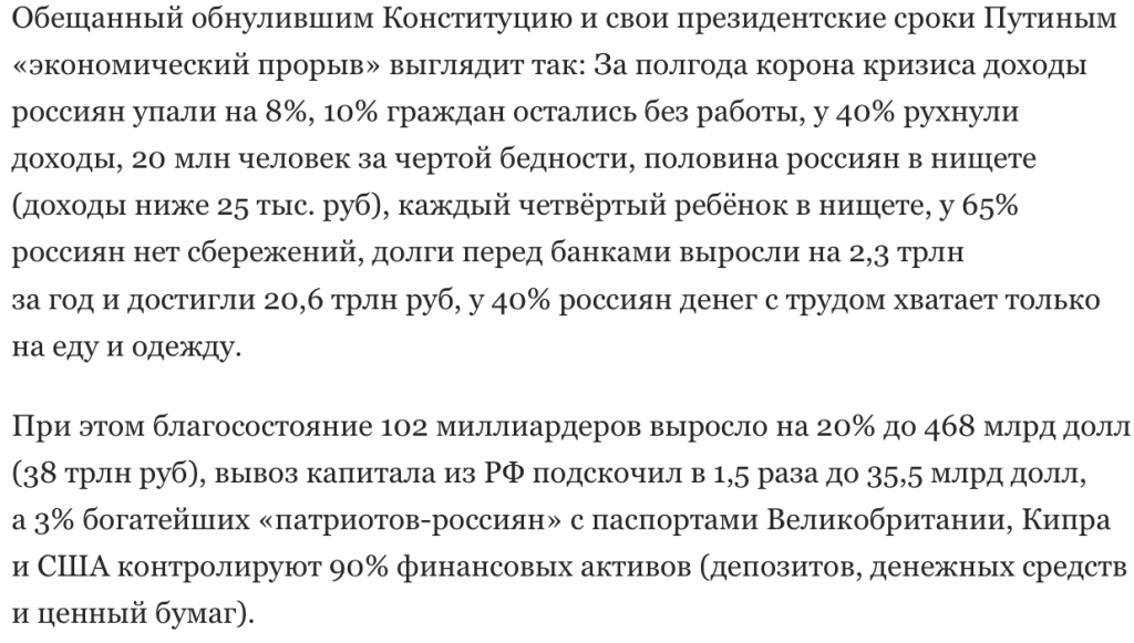 Здравствуйте! Вы видели грабли на рисунке перед строем идущих? Вот про такие грабли вы сейчас пишите... Надо поменять... Ну поменяйте... Зачем писать о том что не выполнимо? Кто и как сможет поменять? Дёрнитесь - и вам уготована "кутузка"! Не надо трепологию разводить. Мы все хотим перемен к более достойной жизни... Так жить позорно... Бог наверное и наслал на людей эту чуму что бы избавить народ от нищего существования... Нет, в нашей стране, да и ни при каких других режимах, не жил народ богато а выживал. В советское время немного пОжили и всё. Вот живите и не ропщите, такова русская доля...