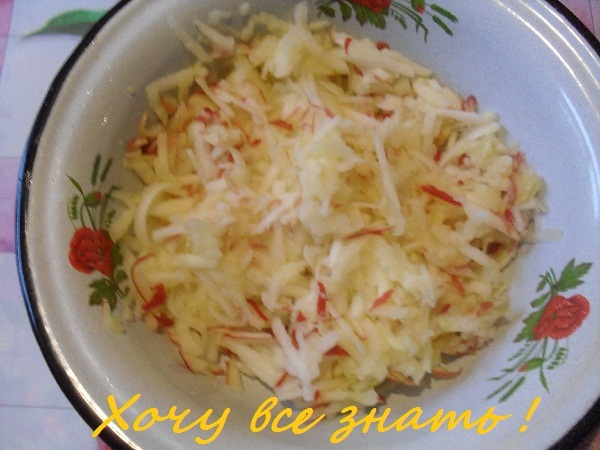 -Вымыть яблоки. Натереть их (лучше на крупной тёрке) или порезать на маленькие кусочки ножиком. Добавить их в тесто и всё перемешать.