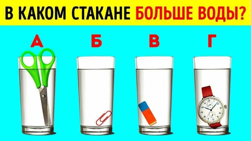 Если не учитывать Архимедову силу, и объем тела в жидкости, то воды в стаканах равное количество, а если учитывать то в стакане Б, воды больше.