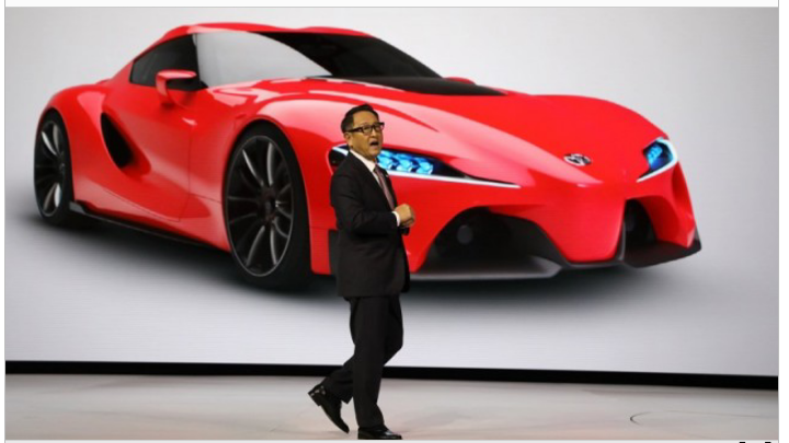 Президент Toyota Motor Акио Тойода выступает перед изображением концепт-кара во время Североамериканского международного автосалона в Детройте.