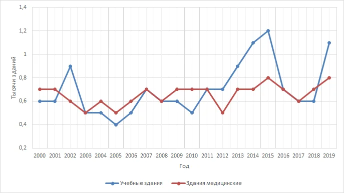 Выясняем, строится ли ещё что-нибудь в России? Для буду пользоваться статистикой Росстата, так как нормальных независимых статистических агентств в Россию пока не завезли. Идем в раздел строительство и качаем таблицу "Ввод в действие нежилых зданий по типам в Российской Федерации". Тут кроется ответ на наш вопрос. Как гражданам, Нам интересней всего объекты социальной инфраструктуры - школы, больницы. Как работникам, нам важно наличие заводов, колхозов и фабрик, поэтому в придачу возьмём ещё промышленные и сельскохозяйственные объекты и сравним их с коммерческими (торговые центры, магазины и тому подобное). Итак начнем с малого, (оно же самое важное) социальные объекты - школы и больницы:
