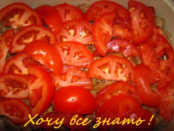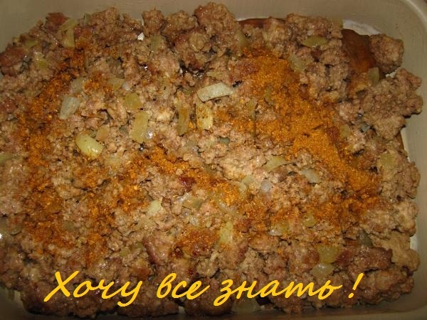 Баклажаны прячем под мясное "одеяло". Выкладываем сверху фарш, пережаренный с луком.