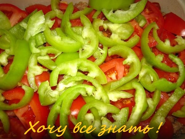Помидоры посыпаем кружочками или полу кружочками сладкого перца.