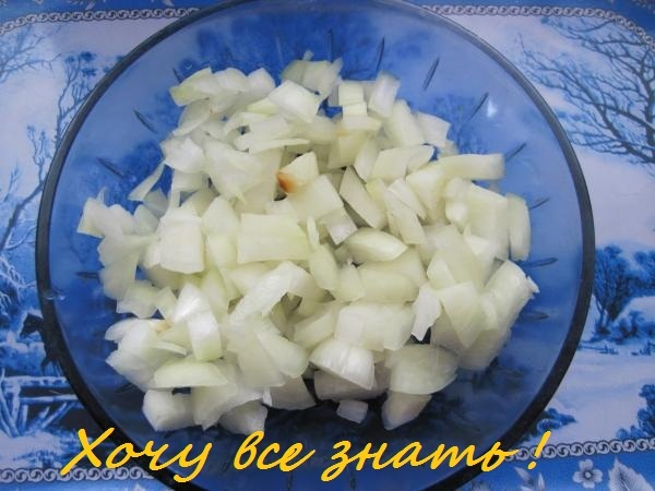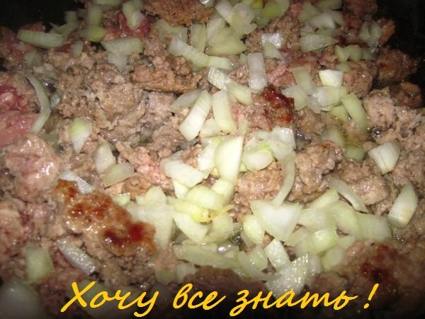 Пока жарится мясо, режем лук на мелкие кубики и добавляем в мясо. Поджариваем.