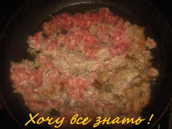Мясо промываем под водой, перекручиваем на мясорубке. Ставим сковороду на огонь, добавляем масло (или жир) и поджариваем перекрученное мясо.