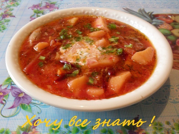 Никому не нужно объяснять, что такое борщ. И хотя в первую очередь это блюдо ассоциируется с украинской кухней, вкусный борщ популярен и в Белоруссии, и в России, и в Литве. Хозяйка, умеющая готовить настоящий красный борщ, всегда заслуживает уважения окружающих. Всем известно, что главным ингредиентом этого супа является свёкла, придающая борщу особый вкус и яркий цвет. Однако, неопытные молодые хозяйки могут не знать некоторых тонкостей приготовления, поэтому у них свёкла при варке обесцвечивается, и желаемого эффекта красивого борща не получается. Если вы хотите узнать, как варить борщ, чтобы он получился вкусным, ароматным и по-настоящему красным, прочитайте следующий рецепт.
