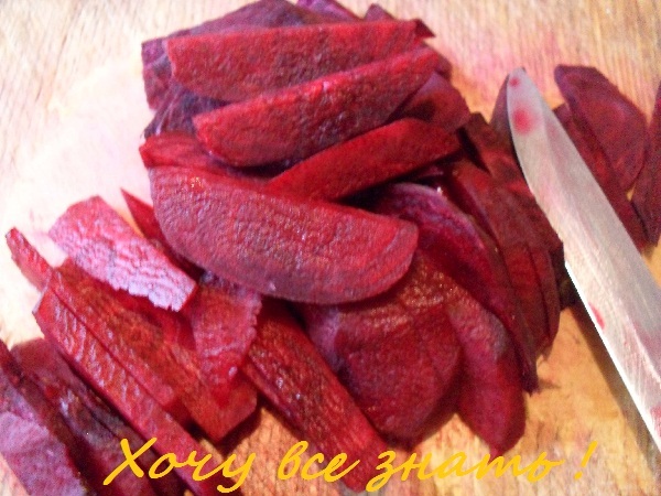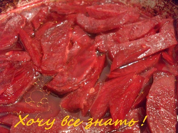 -Свеклу сложить в сковородку, залить бульоном и обязательно добавить туда 1-2 столовые ложки уксусной эссенции. Тушить свёклу с добавлением уксуса на маленьком огне, пока не выкипит весь бульон.