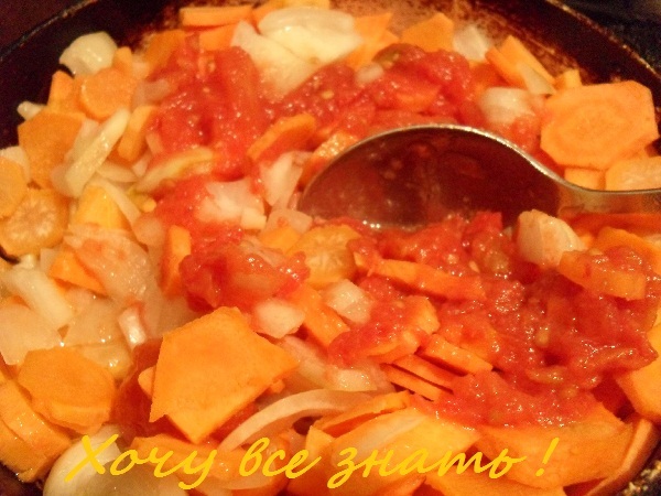 -Пассеровать лук и морковку в растительном масле на сковороде (можно добавить свежие или солёные помидоры).