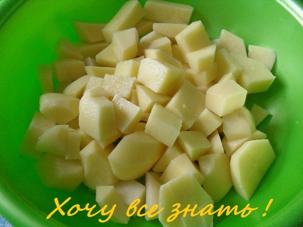 -Картофель вымыть, почистить, нарезать кубиками и тоже опустить в кастрюлю.
