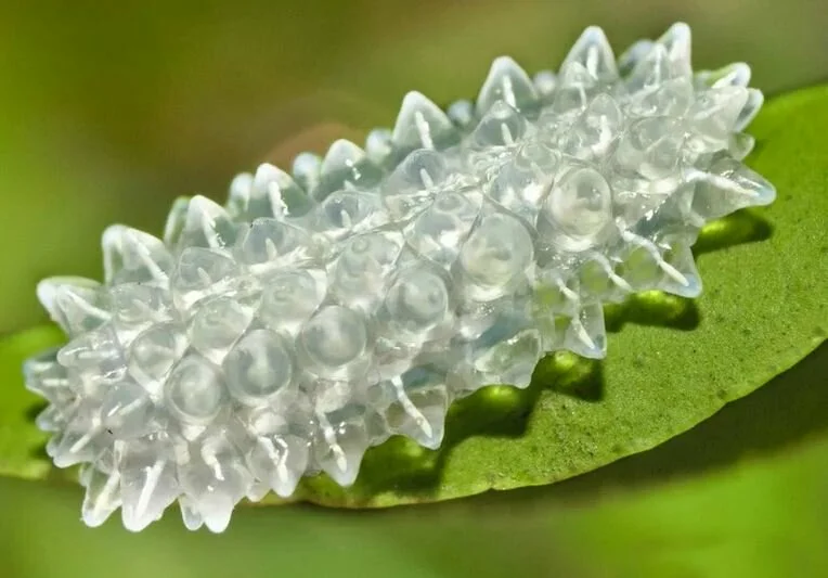 Удивительные гусеницы все покрыты желеобразными выростами, которые немного напоминают тупые шипы. Причем тело их не всегда чисто прозрачное.
