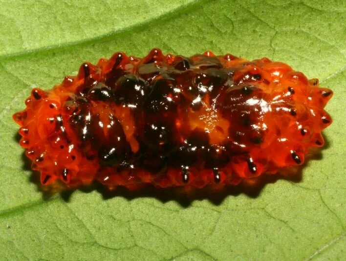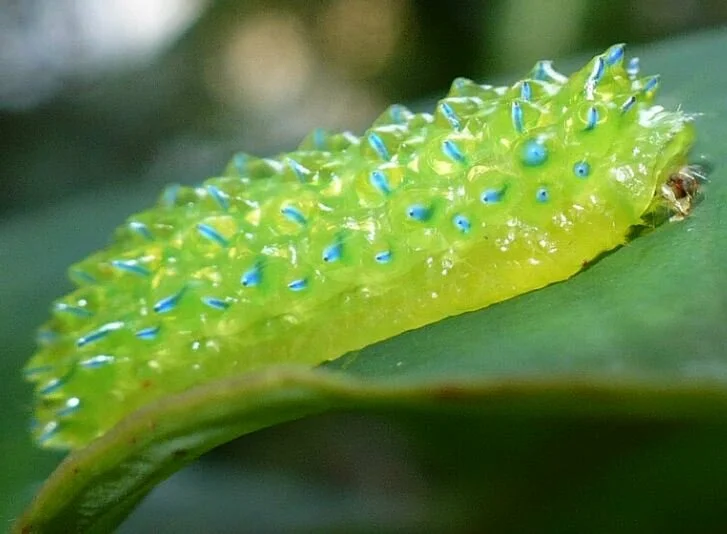 Природа не просто так делает этих гусениц мармеладными. Благодаря своим студенистым наростам они не боятся бесстрашно поедать листья на виду у своих врагов - птиц и других хищников.