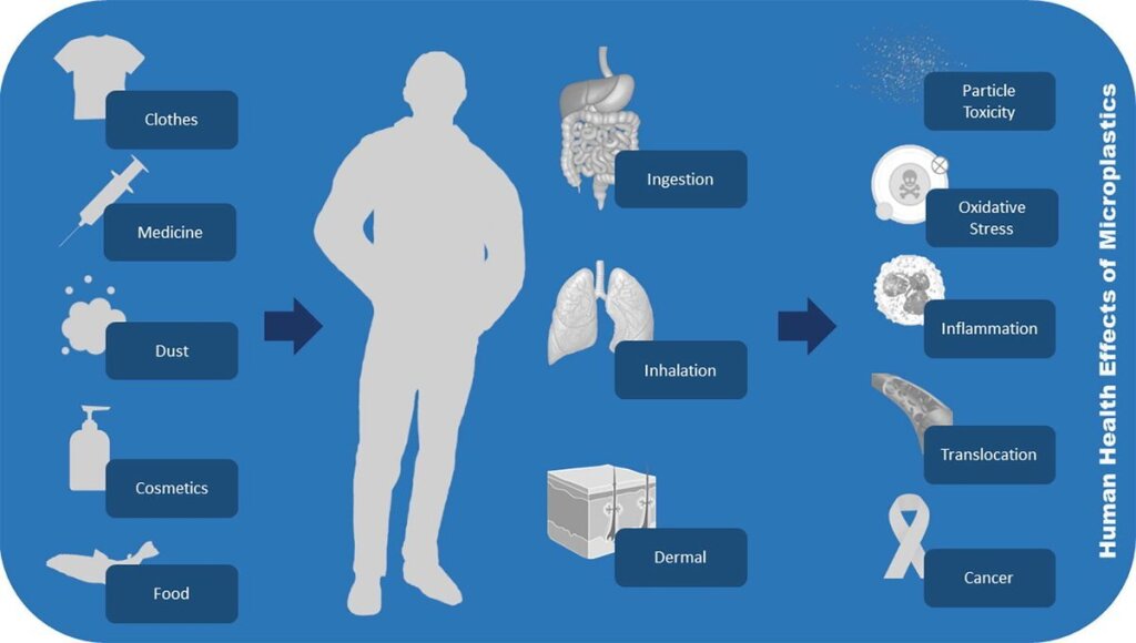 Внутри тканей микропластик рассматривается организмом как инородное тело, что вызывает местные иммунореакции. Мелкие частицы могут вызывать внутренние повреждения тканей и быть носителями токсичных веществ, приводящих к отравлению и даже смерти организма.