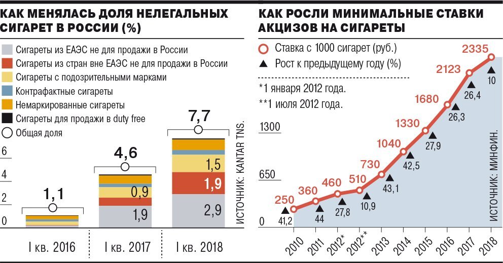 Ниже представлены графики на которых можно увидеть связь между ростом акцизов и снижением рынка сигарет в РФ.