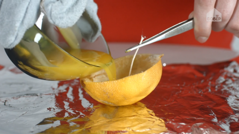 В оставшуюся кожуру заливаем парафин, аккуратно придерживая фитиль;
