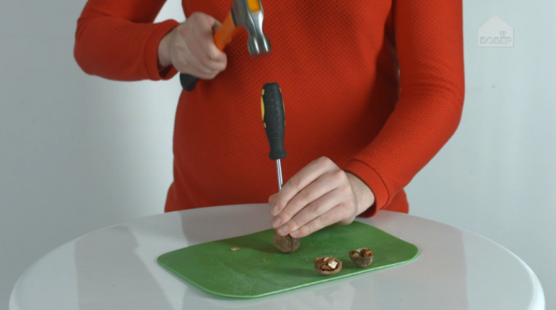 Раскалываем скорлупу грецкого ореха надвое, содержимое отправляется в новогодний салат;