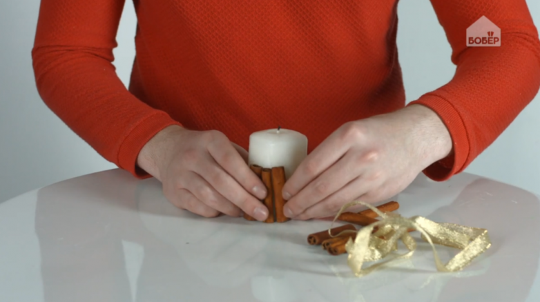 Понадобится всего один ингредиент — палочки корицы, которыми нужно обложить подсвечник по периметру и обвязать лентой.