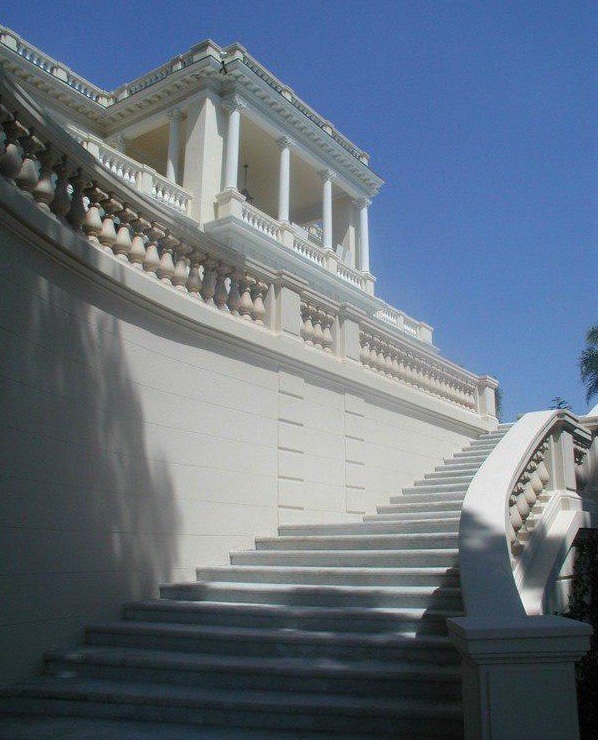 Беломраморный фасад виллы украсили колонны ионического ордера. Высокую лестницу охраняют сфинксы.