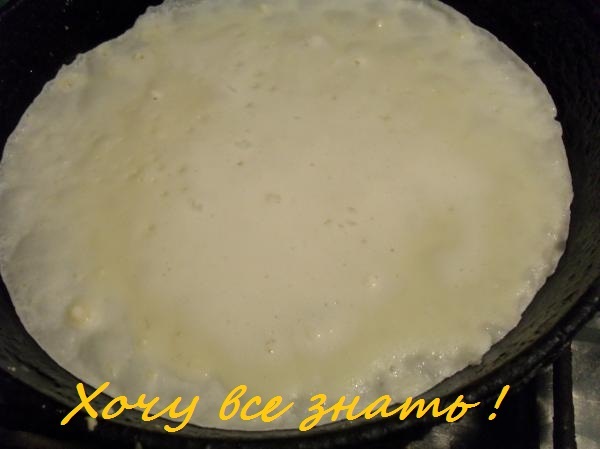 -Разогреть толстостенную сковородку, добавить на дно растительного масла, специальным черпаком налить тесто на сковородку, наклоняя её так, чтобы тесто растеклось равномерно по всей её поверхности. Дать зарумяниться блину с нижней стороны.