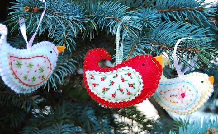 Яркие птички из фетра с вышивкой нашли свое место на елке
