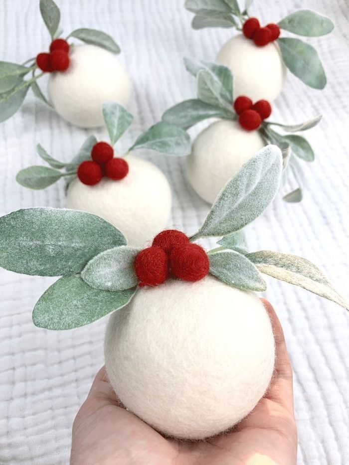 Елочный шар из белого фетра с ягодами и листьями