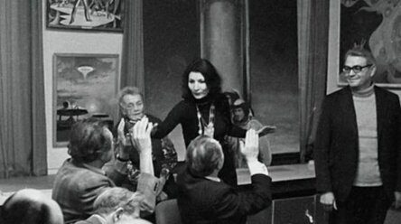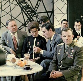 В 1963 году знаменитый космонавт в компании Валентины Терешковой, Вячеслава Тихонова и Ивана Любезного стал почетным гостем в Центральной студии телевидения. Очевидно, что в кадре чувствует себя Гагарин как «не в своей тарелке».