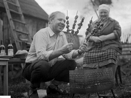 На снимке знаменитый советский клоун приехал на дачу пожарить шашлыки. Выглядит счастливым и жизнерадостным, каким и всегда был при жизни.