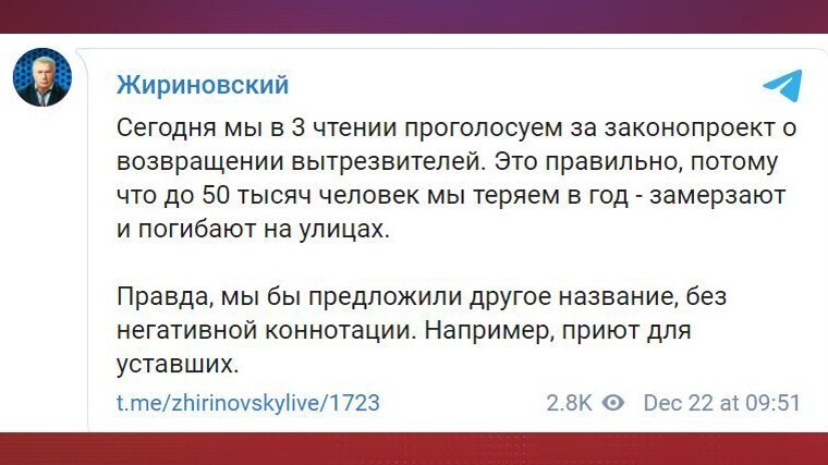 «Это правильно, потому что до 50 тысяч человек мы теряем в год — замерзают и погибают на улицах. Правда, мы бы предложили другое название, без негативной коннотации. Например, приют для уставших», — написал Владимир Жириновский.