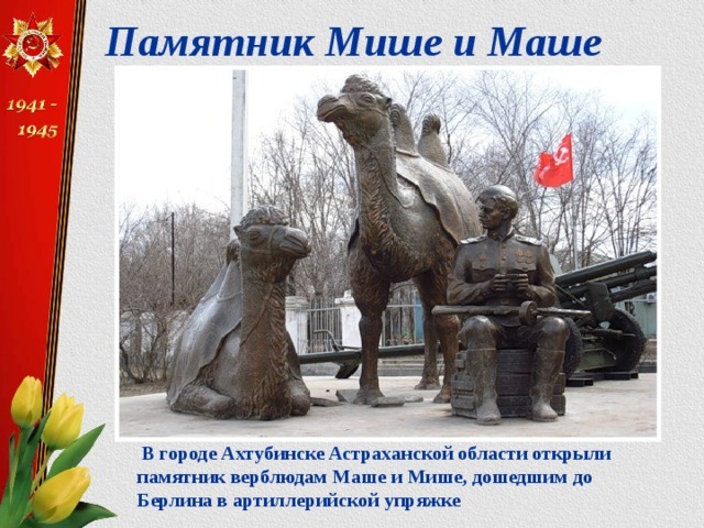 И не только олени. Когда уже просто не хватало лошадей, вносили свой вклад в Победу такие могучие и выносливые животные как верблюды. Мишка, Машка, был еще Яшка...