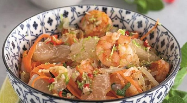 Помело очистить и разобрать на дольки, очистить их от пленок и нарезать мякоть ломтиками. Листья мяты мелко порубить, а зелень кинзы порвать руками на крупные кусочки.