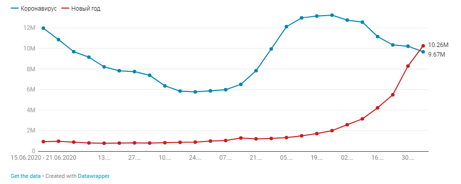 В конце декабря количество сообщений и поисковых запросов о коронавирусе продолжит снижаться. Жителей России все больше интересуют елки и «Оливье».