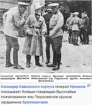 Командир Кавказского корпуса генерал Ирманов показывает боевым товарищам Высочайше пожалованное ему Георгиевское оружие, украшенное бриллиантами.