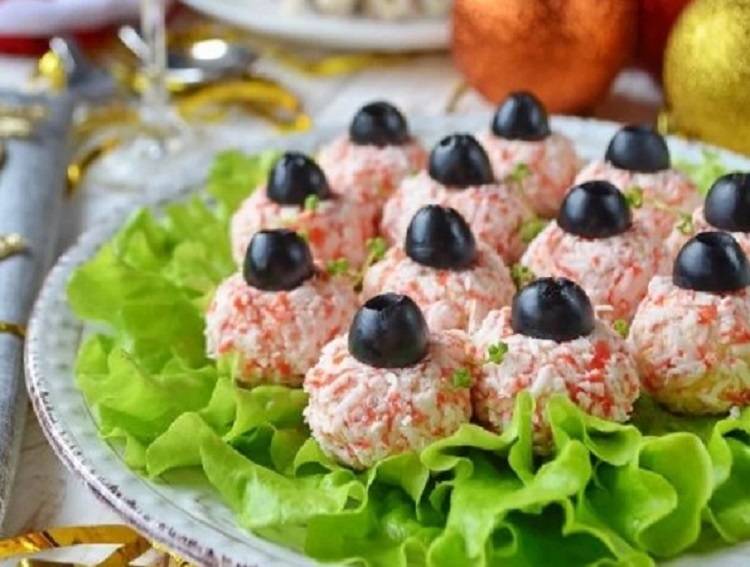 Из рыбной массы сделать шарики, расплющить их, положить в каждый немного начинки из крабовых палочек с маслинами, и сформовать шарики снова. Обвалять каждый в измельченных крабовых палочках и выложить на тарелку, на листья салата. В каждый шарик воткнуть маслину. Сверху можно сделать петельку из зеленого лука (при желании).