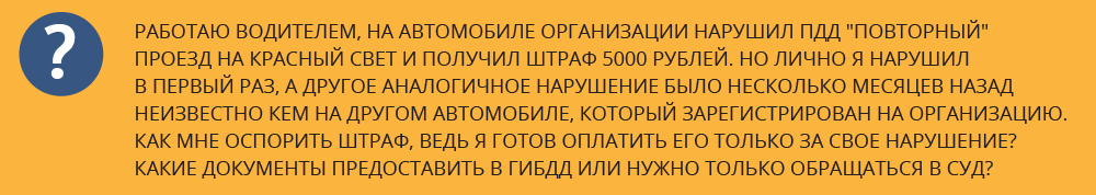 Юрист Европейской Юридической Службы Дмитрий Безделин поясняет, что водителю необходимо обжаловать постановление инспектора в суде: "Надо указать, что при первом нарушении автомобилем управляло другое лицо, владеющее им на законных основаниях". В качестве доказательств необходимо предоставить страховой полис, куда был вписан виновник, трудовой договор или приказ о приеме его на работу в качестве водителя, добавляет эксперт. По его словам, не лишними будут показания свидетелей или автомобилиста, который проехал в тот день на красный.