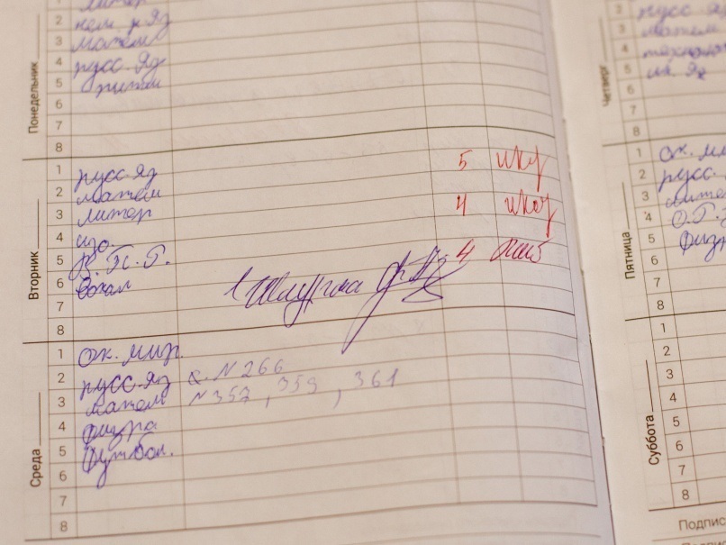— Ну давайте, показывайте дневники. Домашнее задание все записали? — бдит мужчина за стойкой. — Кто не записал, берите дневники у одноклассников, садитесь и переписывайте.
