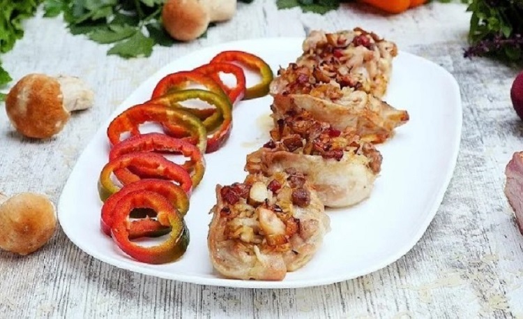 Куриные грудки вымыть, обсушить бумажным полотенцем, разрезать каждую по толщине пополам, не прорезая до края, после чего отбить в развернутом виде, посыпать солью и перцем. На каждую грудку положить по ложке приготовленной грибной начинки, и, подвернув края, скатать рулетом, сформовав, попьеты. Каждый попьет завернуть в ломтик бекона и заколоть шпажкой или связать ниткой.