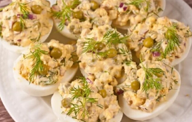 Кальмары отварить, нарезать мелкими кубиками и смешать с желтковой массой. Добавить зеленый горошек. По желанию можно добавить мелко нарезанный красный лук. Полученной начинкой нафаршировать яйца, украсить листиками укропа (или петрушки).