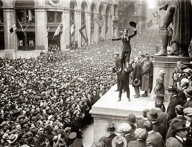 Чарли Чаплин собирает толпой американцев на площади у Национального мемориала, на Уолл-стрит, 1918