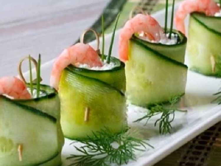 Рулетики из огурца с сырной начинкой и креветками на Новогодний стол