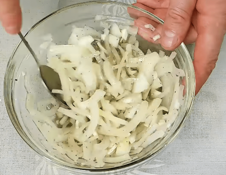 Мелко нарезаем лук, добавляем к нему соль, перец, воду, уксус, а затем хорошо перемешиваем и оставляем мариноваться.