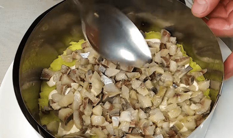 По сути салат состоит из 2 частей. Нижняя во многом напоминает всеми любимую и проверенную временем сельдь под шубой, а верхняя добавляет пикантности и одновременно выступает в качестве съедобного декора.