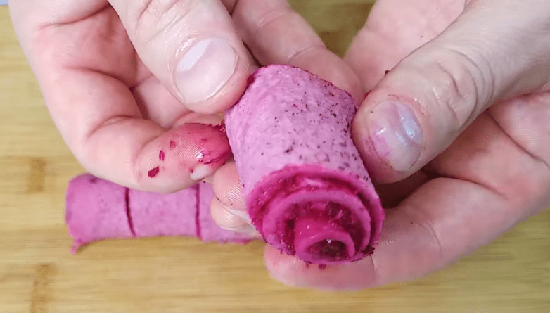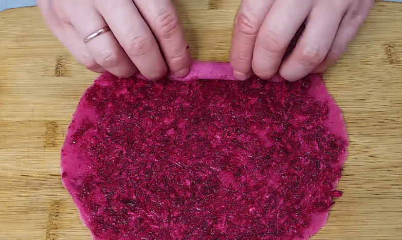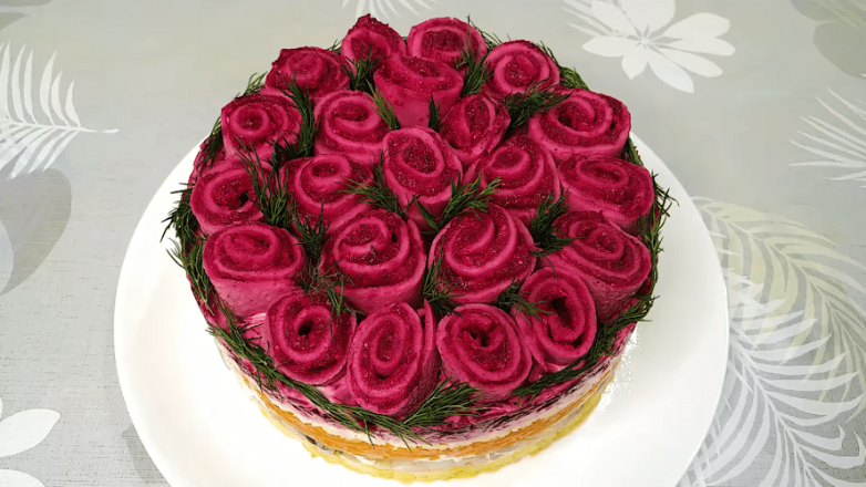 Обрезав блин с краев, нарезаем на кусочки высотой в 1.5-2 см. Слегка надавив на кусочек снизу, получаем «розочку». Дальше остается лишь разместить сформированные розы на свекольном слое и снова отправить салат в холодильник для пропитки.