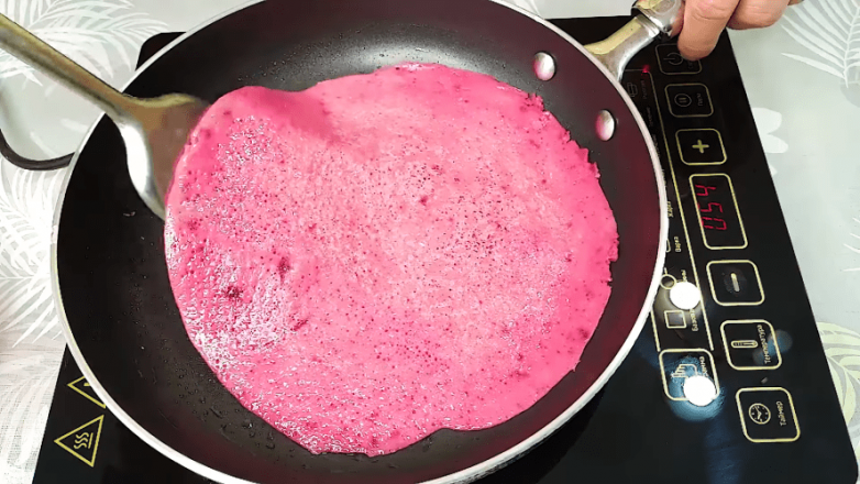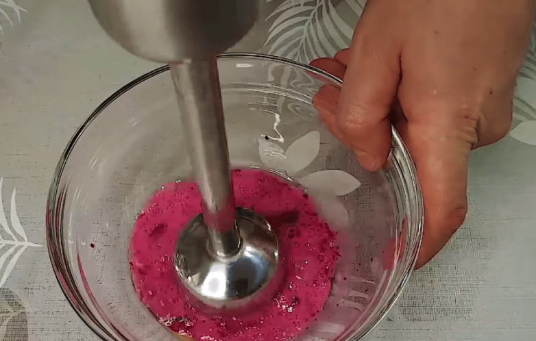Основой для роз станут несколько блинчиков. Вбиваем в подходящую емкость 1 яйцо, добавляем к нему тертую свеклу и взбиваем блендером до однородности. К получившейся массе добавляем соль, молоко, растительное масло и муку. Все тщательно взбиваем до однородности.
