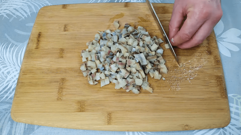 На крупной терке по отдельности натираем яйца, картофель, морковь и свеклу. Сельдь нарезаем мелким кубиком.