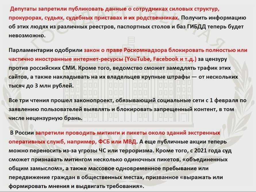 Отдельной строкой хочется прописать, что не смотря на все сложности работы в масках и перчатках, депутаты напряглись и приняли революционные и давно требуемые всеми простыми россиянами законы о пожизненном сенаторстве президента и экс-президента, а так же о полной неприкосновенности этих господ и их родственников перед законами Российской Федерации.