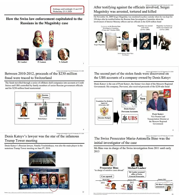 Дело в том, что в течение последних нескольких дней в некоторые редакции, как в иностранные, так и в российские (точнее, оппозиционные – «Новая газета», «Медуза», «Эхо Москвы» и тд. Полный список имеется) поступила удивительная методичка на 60 (шестидесяти!) страницах с иллюстрациями и схемами, обязательными для публикации. Название документа простое: «Как швейцарские правоохранительные органы капитулировали перед русскими в деле Магнитского» и в нем подробно и наглядно разъясняется то, что «все неправда», а на самом деле «Магнитского убили в СИЗО за то, что он раскрыл схему отмывания миллиардов», а потом «спрятали украденные деньги в Швейцарии». Основной смысл указанной методички заключается в том, что «плохие русские» оказывается «коррумпировали швейцарское правосудие» и теперь ему, швейцарскому правосудию, нельзя верить ни в коем случае, а можно верить только международному мошеннику Браудеру и преданным адептам «дела Магнитского». Истерика? Однозначно.