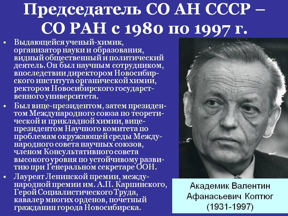 В 90-е годы во главе Сибирского отделения находился выдающийся учёный, настоящий гражданин, коммунист Валентин Афанасьевич Коптюг. Семнадцать лет академик Валентин Афанасьевич Коптюг руководил Сибирским отделением РАН. Почти столько же, сколько и Михаил Алексеевич Лаврентьев. Но с одной принципиальной разницей. Лаврентьев начинал своё великое дело по преобразованию Сибири с помощью науки при полной поддержке государства, а Коптюг продолжал его дело при сопротивлении и небрежении поломанного государства к науке в Сибири (Ролен Нотман).