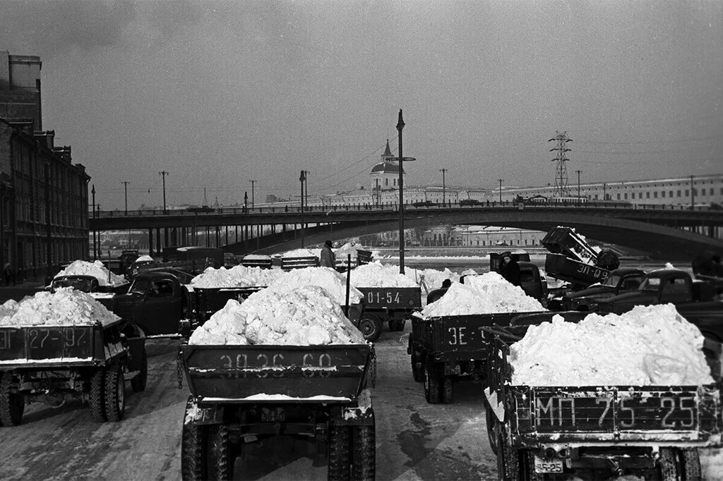 А вот на фото запечатлен сброс снега в реку. Экологично ли это? - возникает первая мысль. С одной стороны, в те времена столько гадости на дороги не выливали, а с другой - автомобильный выхлоп всё равно же оседал на снегу.